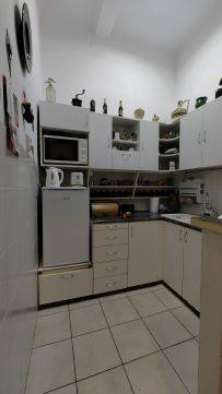 A lakás a hatalmas parkosított udvarból közelíthető meg, a földszinten, ablakai dél-délkeleti tájolásúak, csak a zöld, fákkal, bokrokkal tarkított udvarra néznek, kellemesen napfényes. Nagy nappali, nagy háló, élhető belmagasság, fürdő és wc egyben. Az étkező és a konyha egy légtérben, innen nyílik egy kis kamra is. A fűtése konvektorokkal megoldott, a melegvizet átfolyós vízmelegítő szolgáltatja. Tartozik hozzá egy mintegy 12 m2-es saját alagsori tároló is.