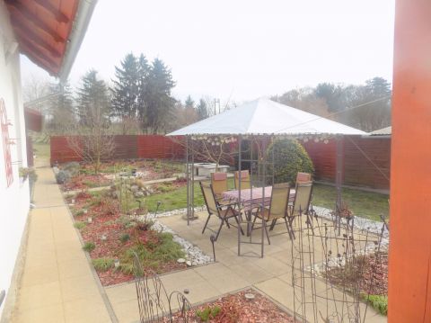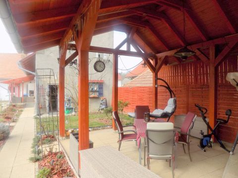 A két lakrészt egy közel 30nm-es fedett terasz köti össze, ahonnan gyönyörködhetünk a rózsákkal beültetett udvarunkba, ahol pergolás kiülőt, szabadtéri szalonnasütőt is találunk. A ház mögött pedig egy nyitott nyári konyha is biztosítja a szabadban tölthető szabadidőnk kellemes eltöltését, ahol tavasztól-őszig kényelmesen süthetünk-főzhetünk, vagy éppen pihenhetünk.