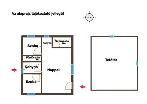 Az ingatlan felosztása: 2 szoba, nappali, 2 konyha, 2 fürdőszoba - wc, fedett terasz kialakítású.