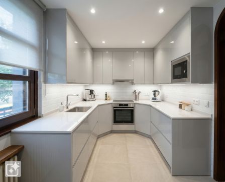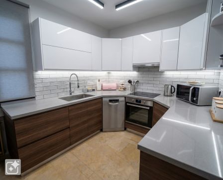 A földszinten helyezkedik el a hangulatosa berendezett, világos konyha.