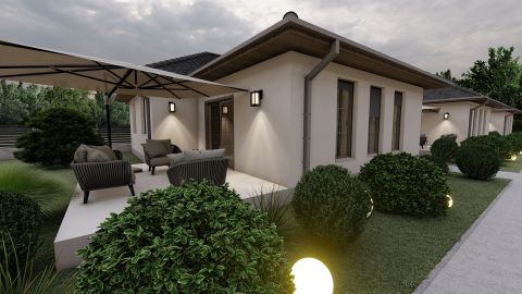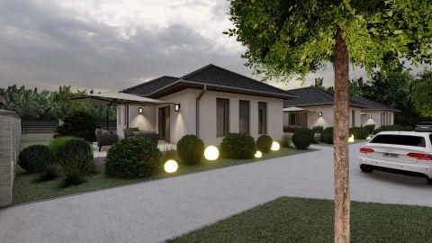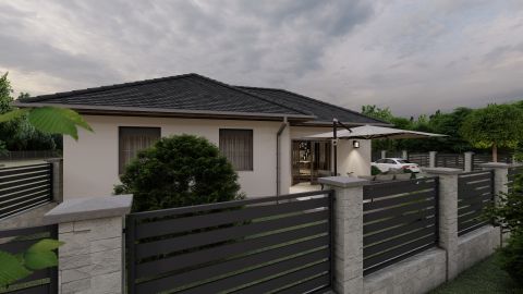 A 369 nm-es telek központi eleme az igényesen megtervezett lakás, mely 30-as N+F Leier téglából épül, a kiváló 15 cm-es homlokzati hőszigetelésnek köszönhetően pedig maximális energetikai hatékonyságot biztosít. A nyeregtetőt korszerű cserepek borítják, míg a fokozott hőszigetelő képességű nyílászárók tovább fokozzák a komfortérzetet. Az épület minden helyisége padlófűtéssel rendelkezik mindezt egy hőszivattyús rendszer működteti, a meleg víz ellátását pedig egy hatékony bojler biztosítja.