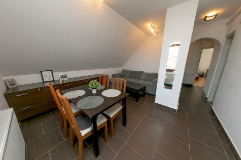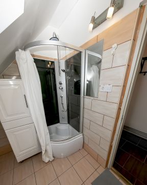 Az első palatetős, 85 nm-es házban két szoba, étkező, konyha, fürdő, toalett, tároló, fedett terasz és pince található. A téli melegről és a használati meleg vízről saját kondenzációs kazán gondoskodik.