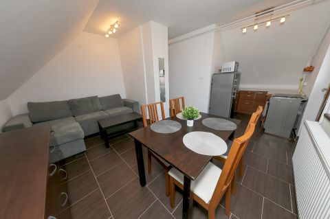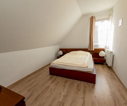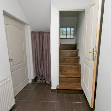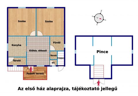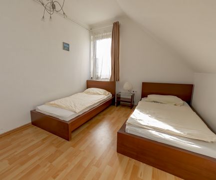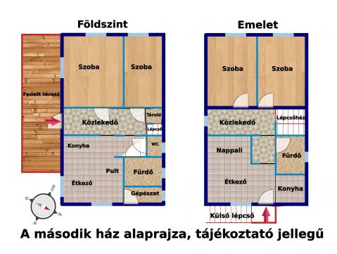 A második ház 130 nm-es, két szintes, szintenként két-két hálószoba, konyha, étkező, fürdő, toalett, tároló. Ebben a házban is saját kondenzációs kazán fűt és biztosítja a meleg vizet. Az emelet a házon belülről és kívülről is elérhető, belül a lépcsőház lezárható, így teljesen elszeparálható a két szint, ez különösen a nyári nyaraltatáskor jelent előnyt!