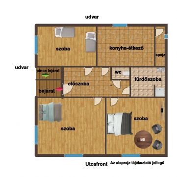Az ingatlanba lépve az előszobából jobbra találunk két utcafronti szobát, amiknek a nyílászárót cserélték az előszoba ablakával együtt. Szemben fürdőszoba, külön WC-vel épült, balról padig a konyha és a kisebb szoba került kialakításra.