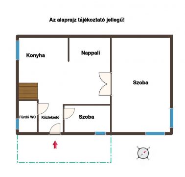 Belépés után az előszobában találjuk magunkat. Jobbra egy kis szoba, balra a fürdőszoba található. Az előszobából továbbhaladva az amerikai konyhás nappaliba érkezünk, melyből jobbra egy nagy található. A konyhával szemben a lejárón keresztül a pincébe jutunk.