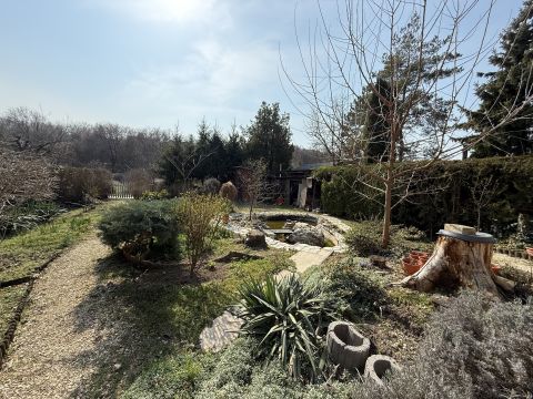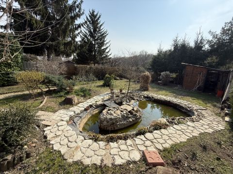 gondozott, parkosított kert kis tóval, dísznövényekkel