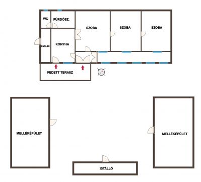 A főépület kb. 100 m²-es, vályog falazatú, 3 szobával, konyhával és fürdőszobával rendelkezik.