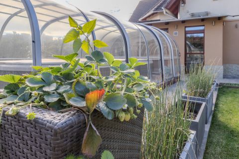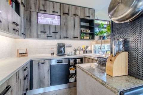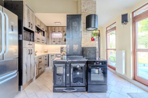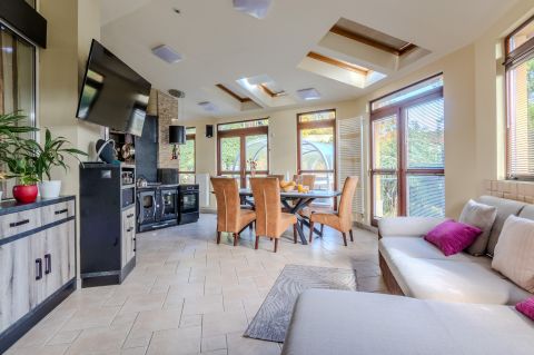 A kertből nyíló, beépített terasz külön aktív konyhával, étkezővel és pihenősarokkal rendelkezik, így az ingatlan két konyhával is büszkélkedhet.