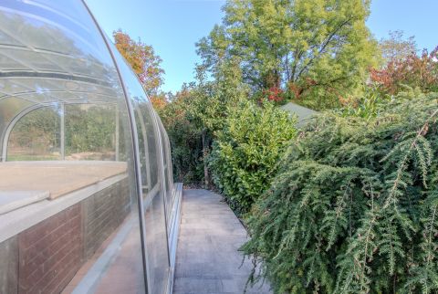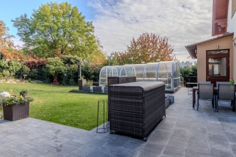 A rendezett, gondozott udvarban jakuzzi, kerti tárolók, valamint kétállásos garázs is található, amely kényelmes parkolást biztosít.