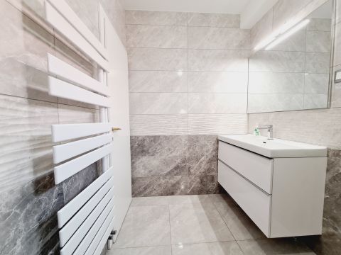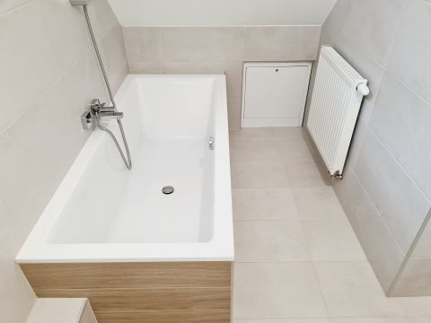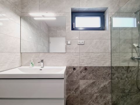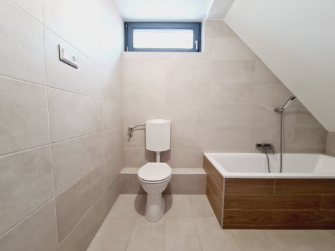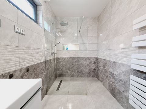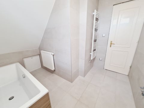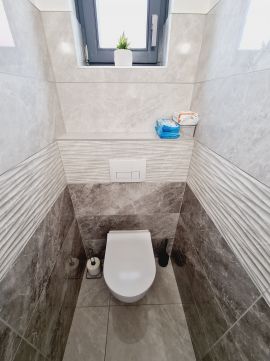 A földszinten a stílusos fürdőszoba mellett külön helyiségben modern, falba épített tartályos, függesztett WC található, míg az emeleten kádas fürdőszoba WC-vel biztosítja a kényelmet. Mindkét fürdőszobában törölközőszárítós radiátor került beépítésre.