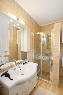 felújított fürdőszoba található, modern burkolatokkal, új szaniterekkel és tusolóval