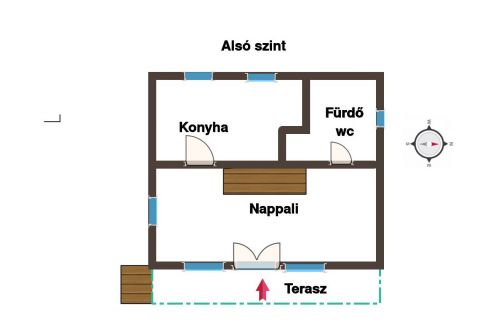 Alsó szinten: fedett terasz,nappali,konyha,