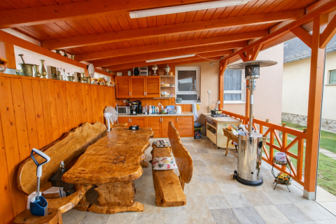 A térkövezett udvar Dunai hullámos térkő burkolattal készült, a bejáratnál kovácsoltvas kerítés található. Az udvaron fedett nyári konyha, bútorozott buli terasz és pihenőrész került kialakításra. Az előterasz fenyőből készült, új burkolattal és zsindely fedéssel.