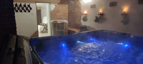 A főépület és az istálló találkozásánál egy wellnessrészleg kapott helyet, jakuzzival, szaunával és merülő dézsával.