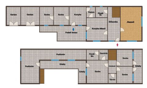 A két lakrész között elhelyezkedő nagyméretű terasz kiváló helyszínt biztosít családi összejövetelekhez, pihenéshez vagy akár egy hangulatos kültéri élettér kialakításához. A tetőtérben három szoba, egy fürdőszoba és két nagy terasz kapott helyet, a felújítása már elkezdődött, azonban még befejezésre vár, így az új tulajdonos saját elképzelései szerint formálhatja tovább, amely jelentősen növeli az ingatlan értékét.