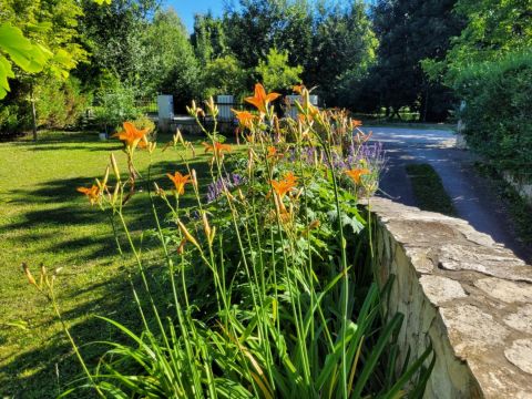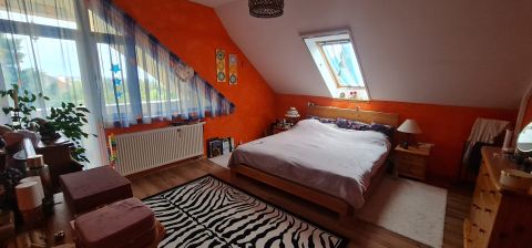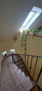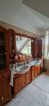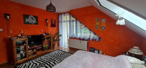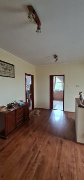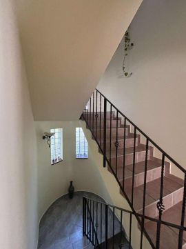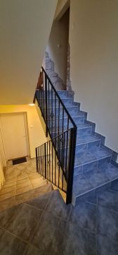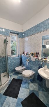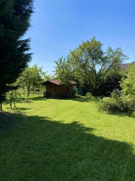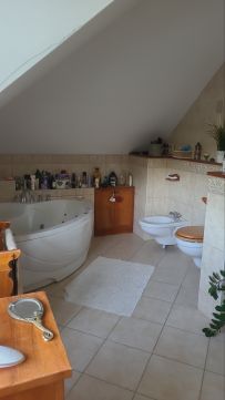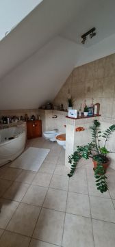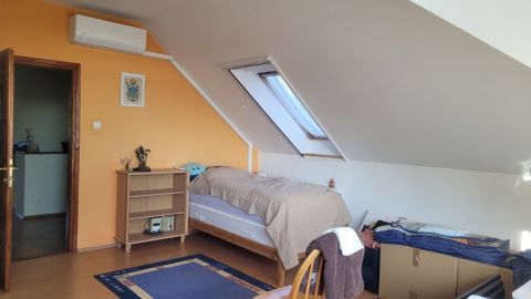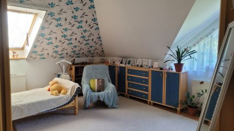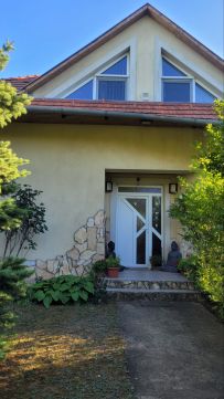 Emelet: három hálószoba, gardrób, tágas fürdőszoba, előtér és loggia a szülői hálóból a gondozott, napfényes kertre néző kilátással