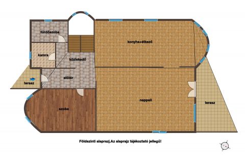 Földszint: tágas előszoba, dolgozószoba, zuhanyzó, impozáns nappali kandallóval, étkező-konyha teraszkapcsolattal