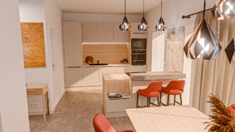A lakás része egy teljesen felszerelt, egyedileg tervezett konyhabútor, valamint a beépített lámpatestek.