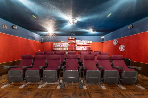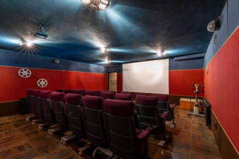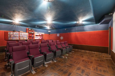 A pincében alakították ki a moziszobát, eredeti tűzálló mozis székekkel, és egy igazi moziban érezheti magát, aki lehuppan a kényelmes székek egyikére. Bevallom, mint filmimádót lenyűgözött a háznak ez a tűpontosan megalkotott része, ami némi kis átforgatással, átrendezéssel egy fergeteges bulihelyszínné is átalakulhat.