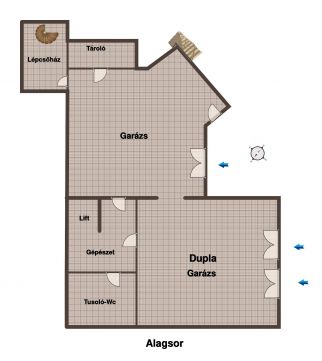Az épület alagsorában 3 állásos garázs került kialakításra, továbbá itt található a gépészeti helyiség és egy tusolóval, wc-vel is ellátott háztartási helyiség.