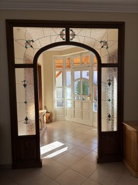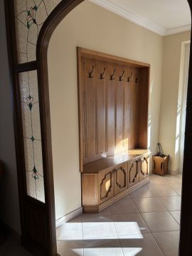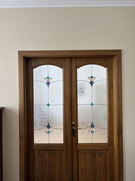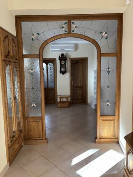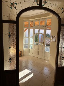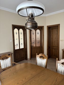 Tömör fa külső és belső nyílászárók, ólomüveges, egyedi beltéri ajtók, igényes részletmegoldások minden helyiségben.