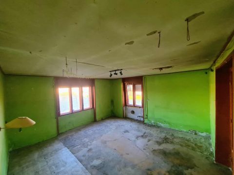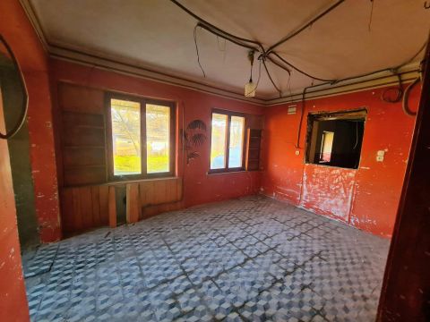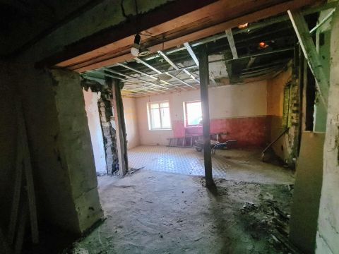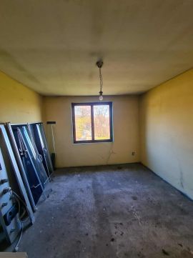 A belső terek felújításra előkészített állapotban vannak a régi burkolatokat és gipszkartonokat eltávolították, hogy a ház tiszta, átlátható alapot kínáljon a további munkákhoz.