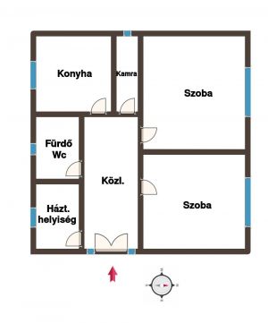 Helyiségek: 2 szoba, háztartási helyiség, konyha, fürdő-wc, kamra, közlekedő.