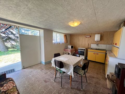 A fűtés fatüzelésű kályhával és villany hősugárzóval megoldott.