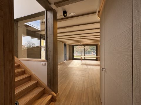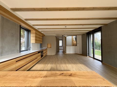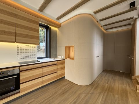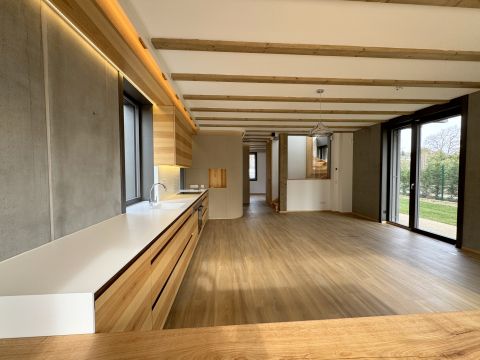 Az ingatlan a modern építészet, a japán ihletésű letisztult design és a természetes anyagok harmonikus találkozása. A fa és a látszóbeton elegáns kombinációja, valamint a nagy üvegfelületek világos, nyugodt és exkluzív lakóteret teremtenek.