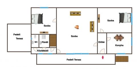 A házhoz 2 db fedett terasz tartozik, az egyik Déli fekvésű, a bejárattal összekapcsoltan,