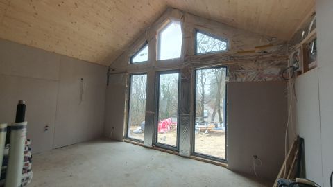 Fehér nemesvakolat, antracit nyílászárók, natúr fa tetőszerkezet letisztult, időtálló design.