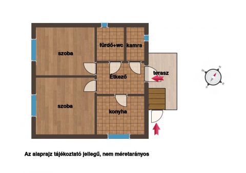 Az 57 m2-es lakóterű ingatlanban két szoba, konyha, étkező, fürdő-wc, kamra található és egy fedett, zárt terasz. Fűtése gázkazánról, melegvíz-ellátása villanybojlerről megoldott.