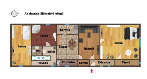 A ház praktikus elrendezésű: előszoba, konyha, étkező, főzőhelyiség, 2 szoba, nappali, valamint fürdő és a WC külön helyiségben található.
