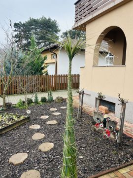 A tágas udvar igényesen kialakított, gondosan gondozott, örökzöldekkel, dísznövényekkel, magas ágyással és termő gyümölcsfákkal.