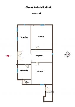 A ház helyiségei: 2 szoba, fürdő wc-vel, konyha, nappali, közlekedő. Külön helyiségben található a padlásfeljáró és a kazánház.