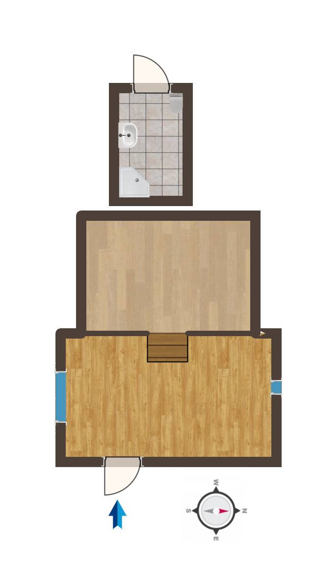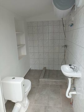 A szobában laminált padló, a fürdőben hideg burkolat található. A meleg vizet villanybojler biztosítja.