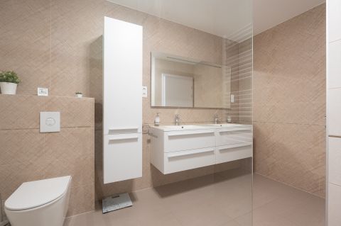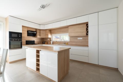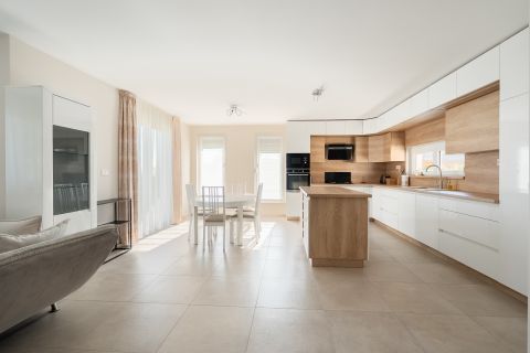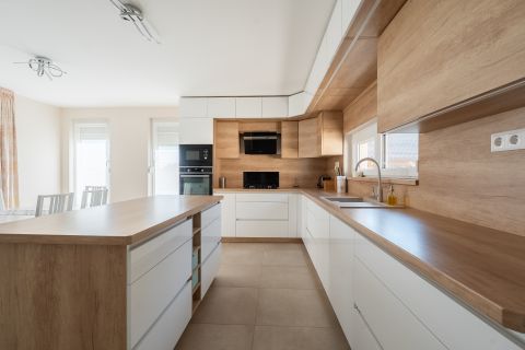 Gépesített konyha konyhaszigettel, mosógép, szárítógép, vízlágyító és az összes képeken látható bútor a vételár része.