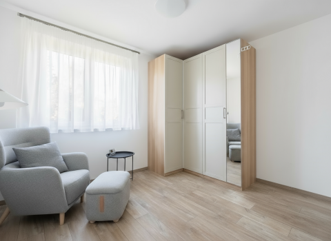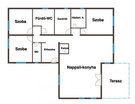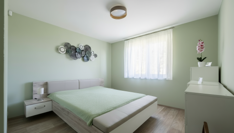 Jól átgondolt elrendezésű épület: az előszobából balra indulva találunk két hálószobát egy mellékhelyiséget, illetve egy fürdő-WC-t.