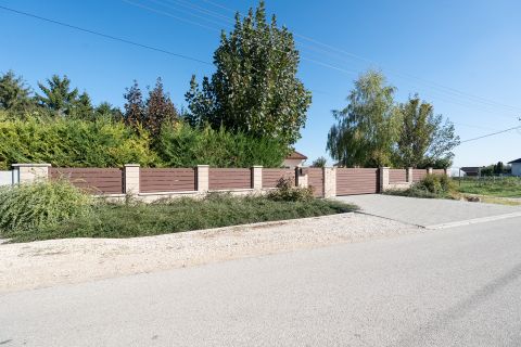 A telek igényes kerítéssel körbekerített, az utcafrontról széles úszókapu nyílik.
