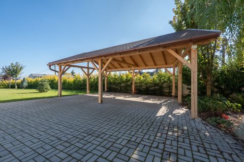 Térkövezett bejárón tudunk kényelmesen ráfordulni a fedett dupla autóbeállóra.