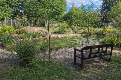 Az ingatlanhoz egyállásos garázs, közös fedett tároló, valamint egy 755 négyzetméteres kert tartozik, ahol egy hangulatos halas tó is kialakításra került. A kert locsolását fúrt kút biztosítja.