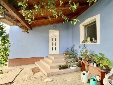A ház előtt térkövezett terasz biztosít kellemes pihenőhelyet.
