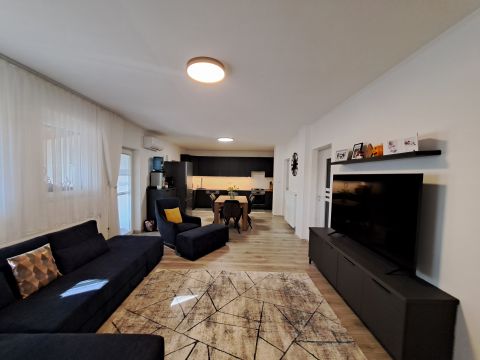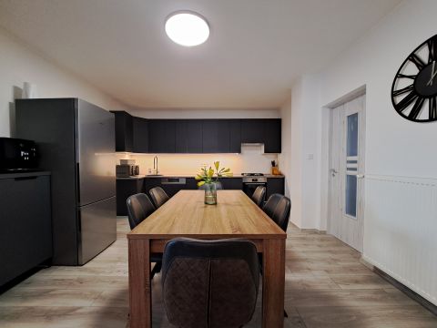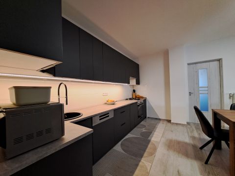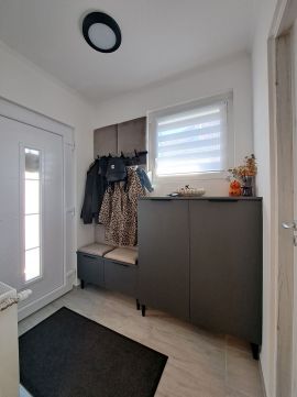 A minőségi, antracit színű beépített konyhabútor, a TV-állvány, komód, valamint az előszobabútor a vételár részét képezik.