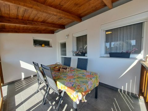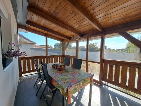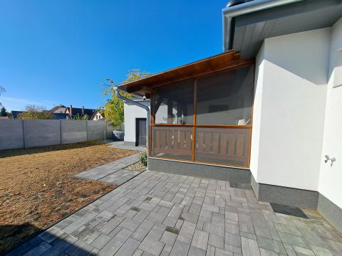 A házhoz 12 m²-es fedett terasz tartozik, alumínium szúnyoghálóval teljesen zárható, így ideális a nyugodt pihenéshez.