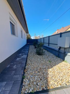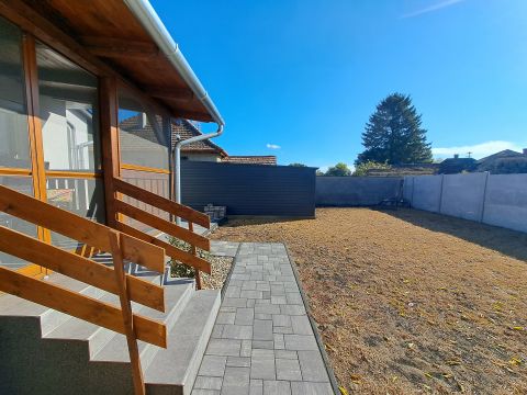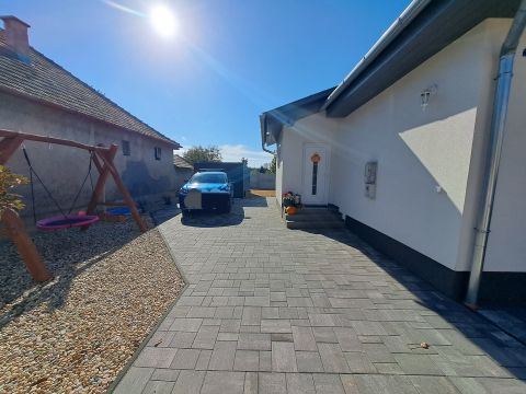 Az udvar térkövezett, a 15 m²-es garázs, továbbá fedett tároló is található az udvaron.