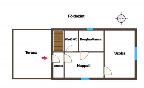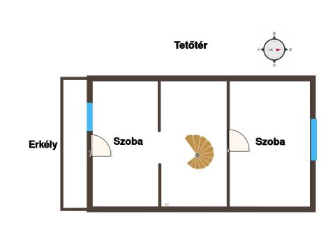 Egy nagy teraszról nyílik a ház bejárata, egy kisebb előszoba után jön a nappaliszoba, innen nyílik a fürdő-WC, a konyha és a földszinti szoba. Innen indul a csigalépcső a tetőtérbe, ahol további két parkettás tetőtéri szoba található, az egyikhez erkély is tartozik. A tetőtér a lépcső fölött lezárható.