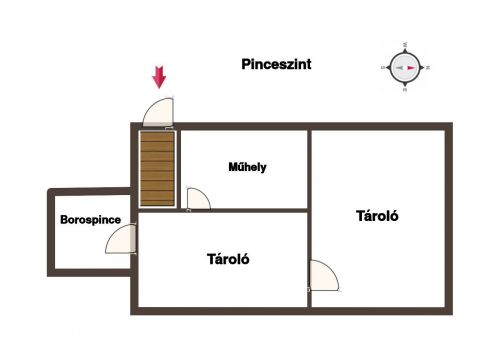 A ház alatt van a pinceszint, ahol kényelmes tárolási lehetőség mellett kis műhely és borospince is helyet kapott.