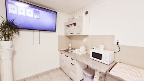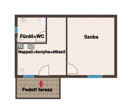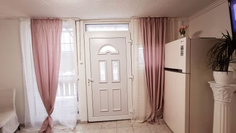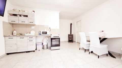 A földszinti lakásrészbe a néhány lépcsőn át az árnyékolt nyitott teraszon keresztül léphetünk be. Az új műanyag ajtón át a világos, egylégtérben lévő nappaliétkezőkonyha helyiségbe lépünk. A konyhabútor új, a főzés gáztűzhellyel (gázpalackkal) lett kialakítva. A tágas helyiségben a hűtő-fűtő klímán kívül egy fatüzelésű kályha is biztosítja (az akár egész földszinti lakás) melegét. Innen nyílik egy külön nyíló, új burkolattal ellátott tágas szoba. A nappaliból nyílik a fürdőszoba is, melyben egy tágas épített zuhanyzó és a WC is helyet kapott. A nappaliból közvetlen kijárat a tágas, árnyékolt délnyugati fekvésű teraszra a mindennapi használat természetes meghosszabbításának lehetőségét rejti magában.