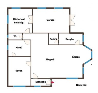 NAGY HÁZ : utcafronti, fedett bejárattal, 42 m2-es tágas nappali-étkezővel épült. Kialakításra került még egy szoba, fürdőszoba, külön WC, mosókonyha, konyha és egy abból nyíló kamra. A mosókonyha folytatásaként, de a belső udvarra nyílik a garázs. Fűtését gázkazán biztosítja.