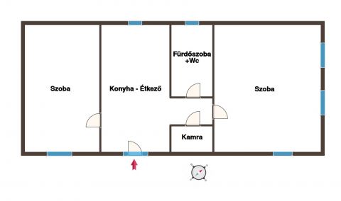 Az ingatlanban egy étkezős konyha, két különbejáratú szoba, egy fürdőszoba+wc, és egy közlekedő helyiségek kaptak helyet. Tárolás céljára egy kamra is rendelkezésre áll. Praktikus elrendezése okán optimális fiatalok, összeköltözők, idősek, kisebb családok számára is.